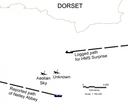 These positions are over three miles apart but this could be explained by tidal corrections or other assumptions made when interpreting the log of HMS Surprise. They are however in the vicinity of St Alban’s Head and close to the position of the wreck which is four miles SSW (202.5º) from St Alban’s Head. As mentioned earlier Captain Lewis of Netley Abbey stated his position to be ‘between 8 and 10 miles east by south half S (magnetic) of the Shambles lightship’. At the time the Shambles lightship was positioned at 50° 30' 50"N 002° 20'W,[4] (N50° 30.8', W002° 20') again providing a final position for Netley Abbey close to the position of the wreck.